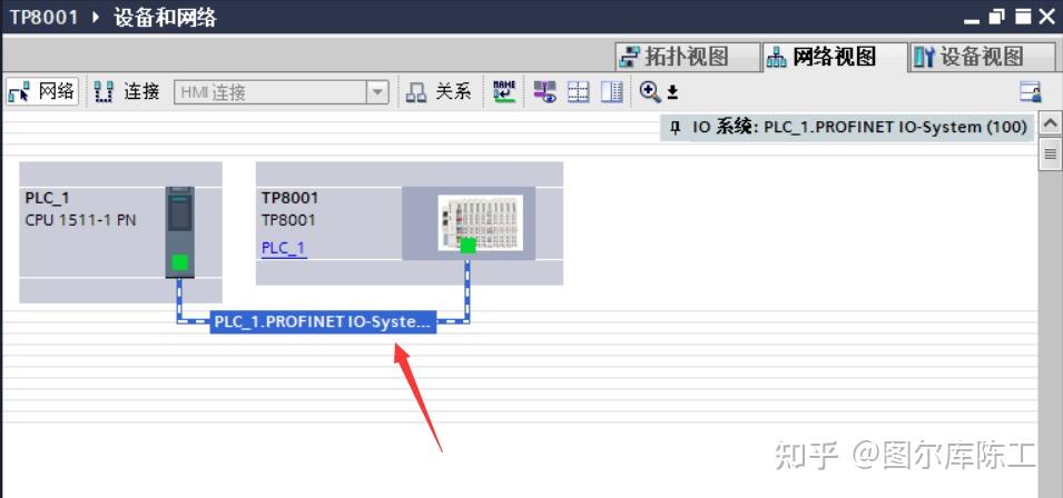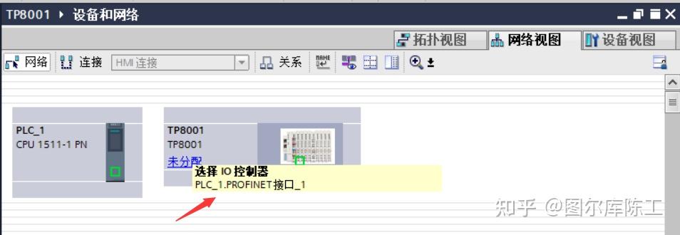 在“网络视图”中,点击从站设备上的“未分配(蓝色字体)”,再点击“PLC_1.PROFINET接口_1(可不同,点击“选择 IO 控制器”的下方);