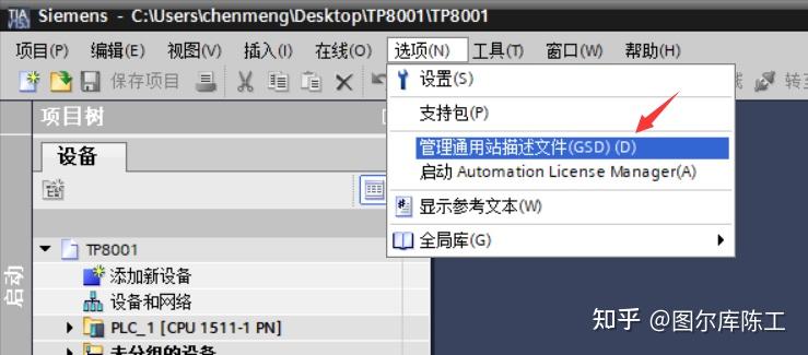 菜单栏中,点击“选项”,选择“管理通用站描述文件(GSD)(D)