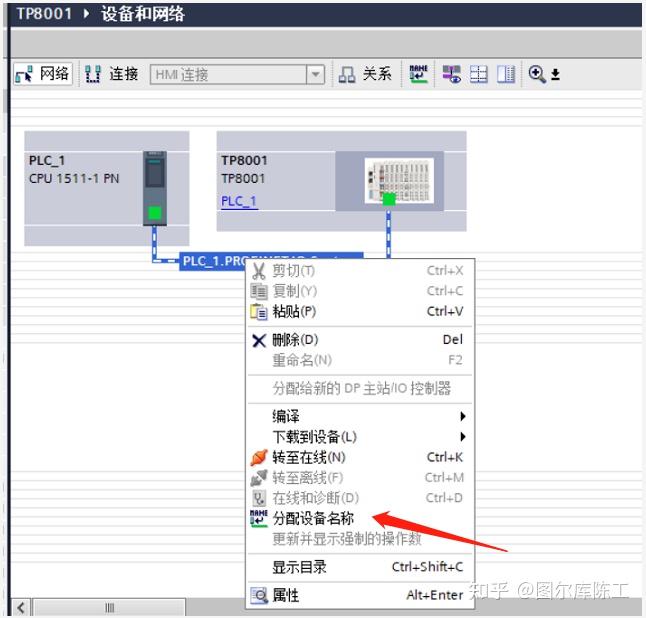 右击PLC 和TP8001的连接线,选择“分配设备名称”