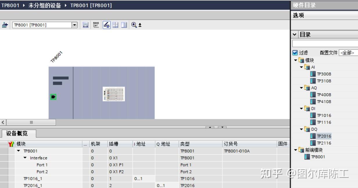 双击“网络视图”中的“TP8001”,在最右侧的“目录/模块”下选择TP8001后边挂的模块型号(顺序必须一致,不然通讯不成功),本例添加TP1016、TP2016各一只(最多可添加32个,因此TP8001 后边最多可挂32个IO模块)。模块后边的“I 地址”为该模块输入监测数据存放地址,“Q 地址”为该模块输出控制数据存放地址。
