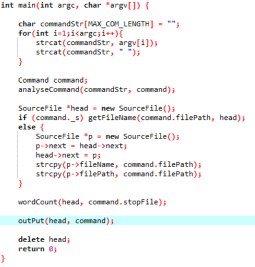 本程序所要求的基本功能是计算文件内的字符、单词和总行数,并实现对结果的指定输出,相对来说功能相对简单。