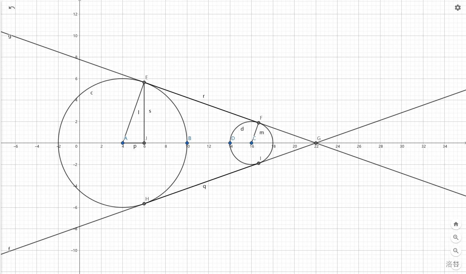 然后可以轻易解出 \(x_G\)。于是就可以得到 \(CG,AG\) 的值,然后利用勾股定理即可得出 \(FG,EG\) 的值。接下来求出 \(\sin \angle EGA\) 的值,作 \(EJ\perp x\) 轴,然后 \(EJ\) 就等于 \(EG\sin\angle EGA\),再利用勾股定理即可求出 \(AJ\) 的值,于是就可以求出 \(E\) 的坐标。对于 \(F\) 同理。于是两切点坐标均可得出。