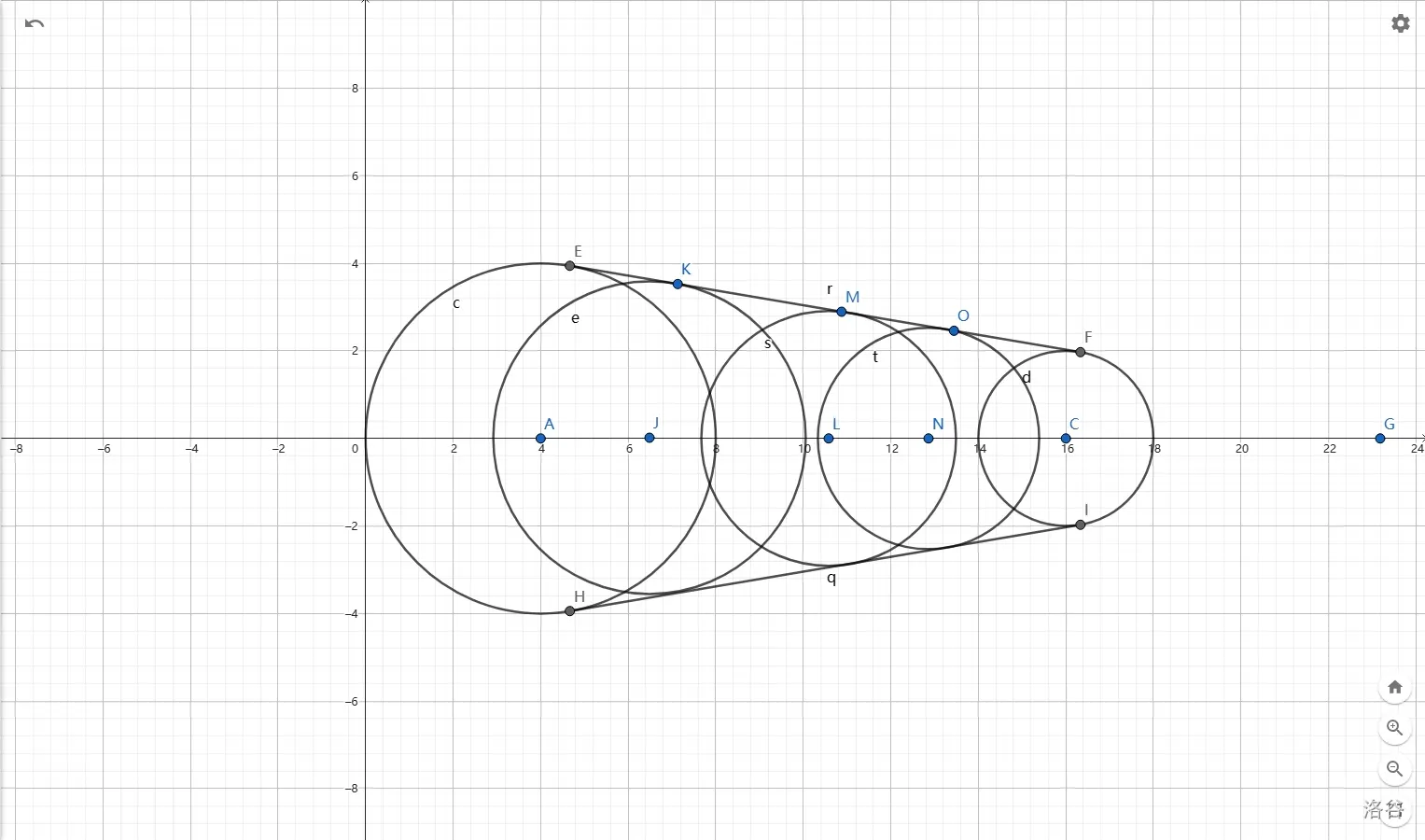圆 \(A,C\) 为圆台的上下底面,那么中间的圆构成的投影正好在两圆公切线之间,即 \(EF,HI\) 之间。