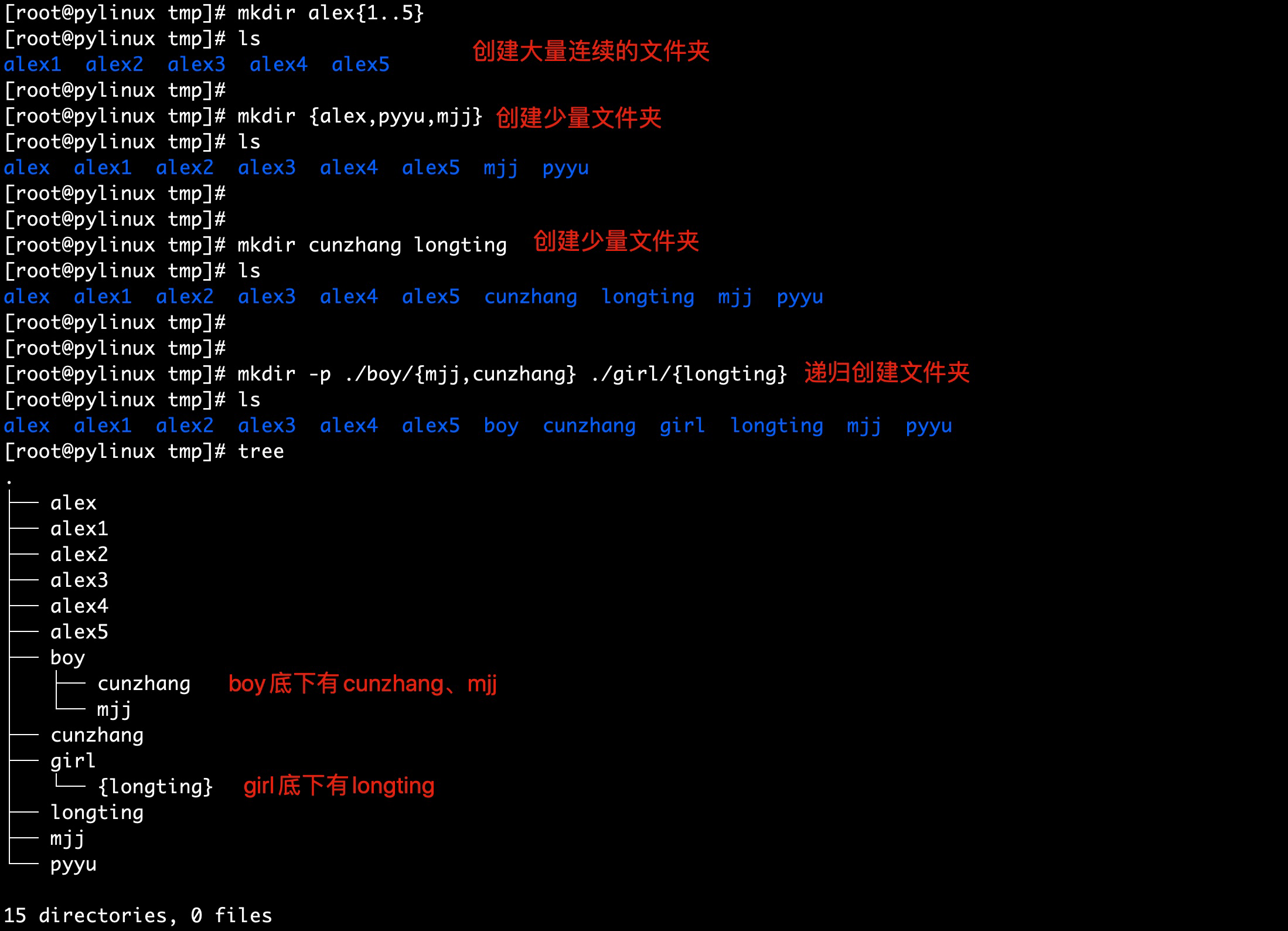 mkdir {alex,pyyu,mjj} 创建三个⽂件夹,逗号隔开