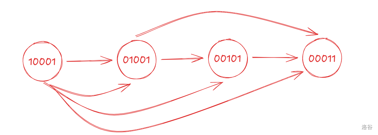 还有问题是 \(110011,101011\) 都能转移到 \(110111\),将状态间转移看作图: