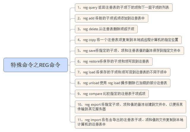Windows自带了一个管理注册表的命令行工具——reg。只需在命令提示符中运行并指定参数,即可以命令行的形式对注册表进行各项管理操作。支持的操作有增删改查、导入导出注册表文件(reg文件)、导入导出或加载配置单元(RegHive)等。