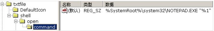 在注册表编辑器(Regedit.exe)中,数据结构显示如下,其中,command键就是open键的子键,(默认)表示该值是默认值,值名称为空,其数据类型为REG_SZ,数据值为%SystemRoot%\system32\NOTEPAD.EXE "%1"
