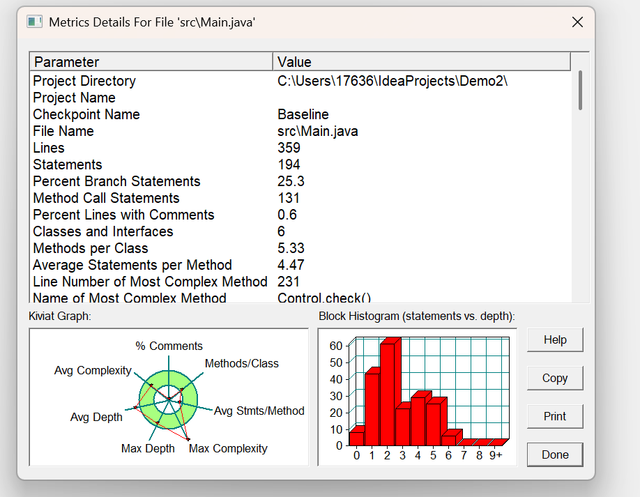 } **基础指标分析** 基本规模指标 总行数: 359行 语句数: 194条 类/接口数: 6个 方法数: 约32个(6类×5.33方法/类) 问题出现在方法拆分不够细致,单个类承载功能过多,缺乏合理的抽象层次,分支语句占比偏高,特别是Control.check()方法复杂度突出,表明该方法承担了过多决策逻辑,可能存在过度嵌套的条件判断,状态管理可能不够清晰。 **代码结构的问题** 平均每个类5.33个方法 平均每个方法4.47条语句 方法复杂度分布不均衡,缺乏类/方法级别的文档注释,关键算法无解释说明,复杂逻辑无注释说明意图。Control.check()方法问题有包含大量嵌套的条件判断,同时处理多种状态和边界条件,违反了单一职责原则 设计问题: 状态管理混乱:高分支占比说明状态转换逻辑分散 缺乏抽象层次:平均方法数尚可但存在极端值,说明抽象不一致 紧耦合:Control类可能过度依赖其他类的实现细节 接近零注释:增加后续维护难度 复杂度集中:check()方法成为系统瓶颈 测试困难:高分支覆盖率难以保证 **第三次代码**import java.util.Scanner;