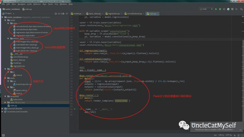 具象化的讲,使用Python与两大框架,对mnist数据集(其本身就是0-9的手写体图片集)进行训练,并将训练后的模型存放在项目中,即ckpt文件,再由Flask暴露路由,由前端将数据传输调用模型计算,验证并返回结果。