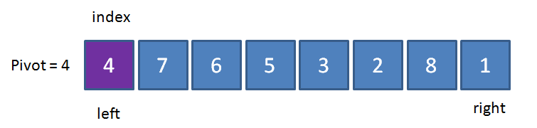这时候,把之前的pivot元素,也就是4放到index的位置。此时数列左边的元素都小于4,数列右边的元素都大于4,这一轮交换终告结束。
