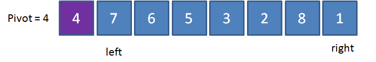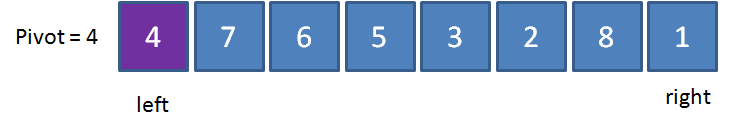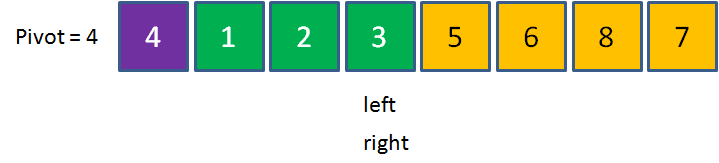 当left和right指针重合之时,我们让pivot元素和left与right重合点的元素进行交换。此时数列左边的元素都小于4,数列右边的元素都大于4,这一轮交换终告结束。
