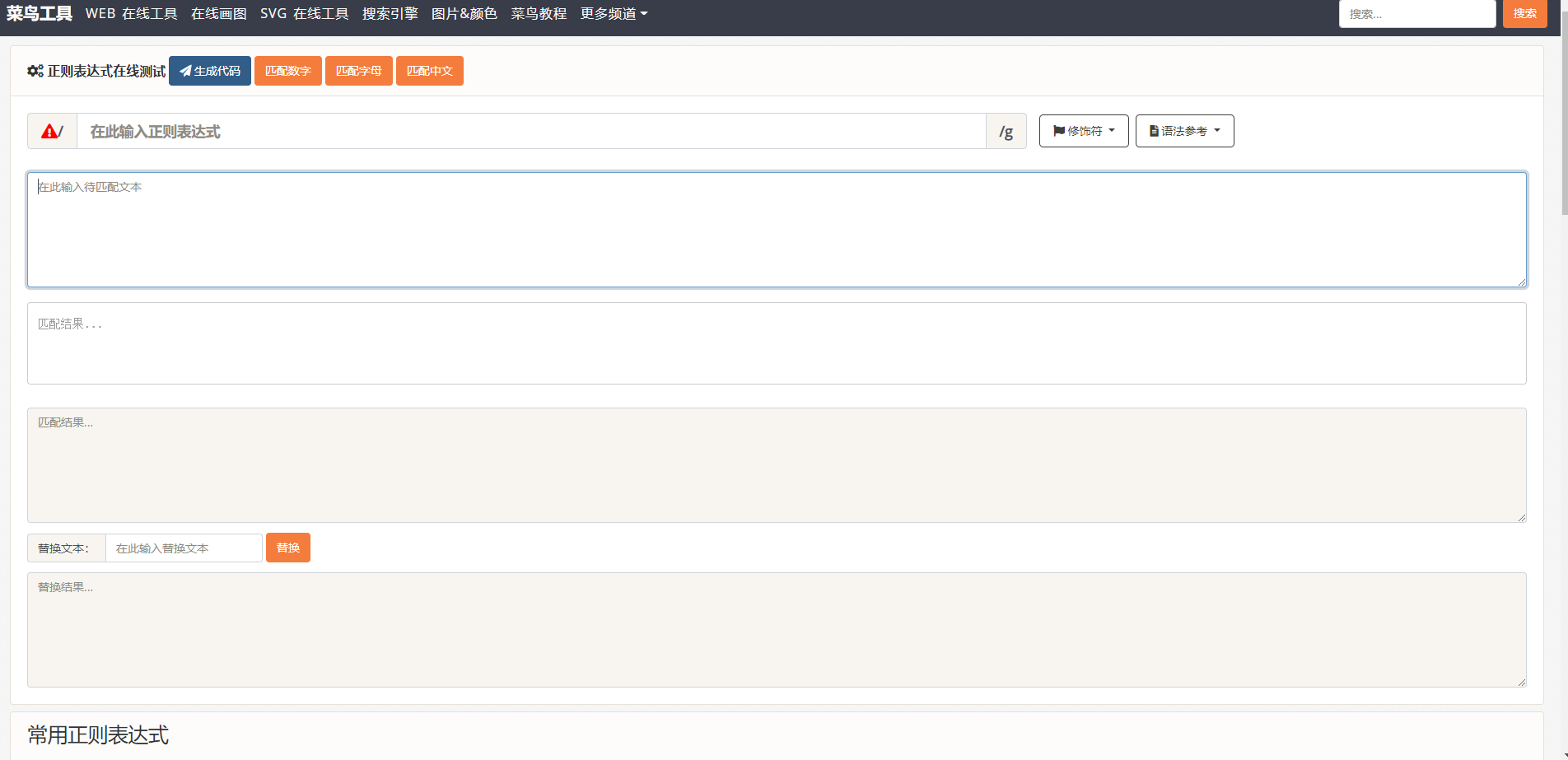 在编写正则表达式时,有一个正则表达式在线测试的网站,觉得挺好用的,正则表达式几乎没怎么错过> https://c.runoob.com/front-end/854/ >,在里面会有些语法参考,这样即便不太记得怎么表达,也可以通过这个参考写出相应的正则表达式,界面如下,还是挺方便的