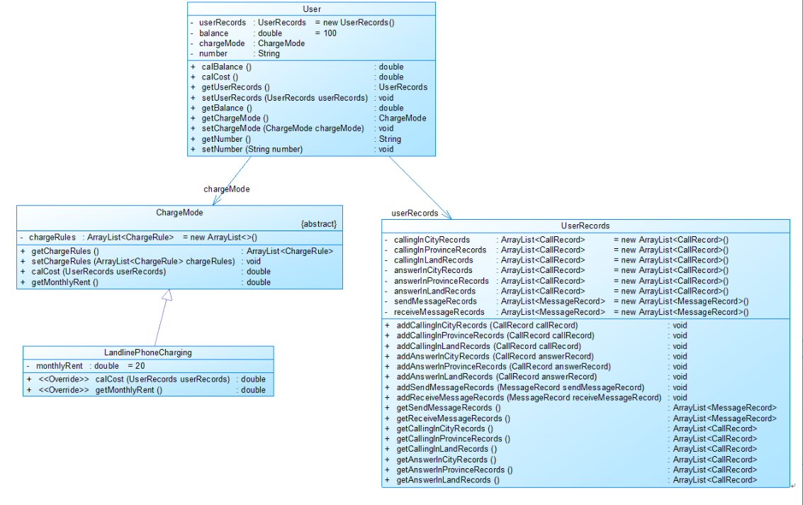 class UserRecord{ private ArrayList<CallRecord> callingInCityRecord=new ArrayList<>(); private ArrayList<CallRecord> callingInProvinceRecord=new ArrayList<>(); private ArrayList<CallRecord> callingInLandRecord=new ArrayList<>(); private ArrayList<CallRecord> answerInCityRecord=new ArrayList<>(); private ArrayList<CallRecord> answerInProvinceRecord=new ArrayList<>(); private ArrayList<CallRecord> answerInLandRecord=new ArrayList<>(); private ArrayList<MessageRecord> sendMessageRecords=new ArrayList<>(); private ArrayList<MessageRecord> receiveMessageRecords=new ArrayList<>();
