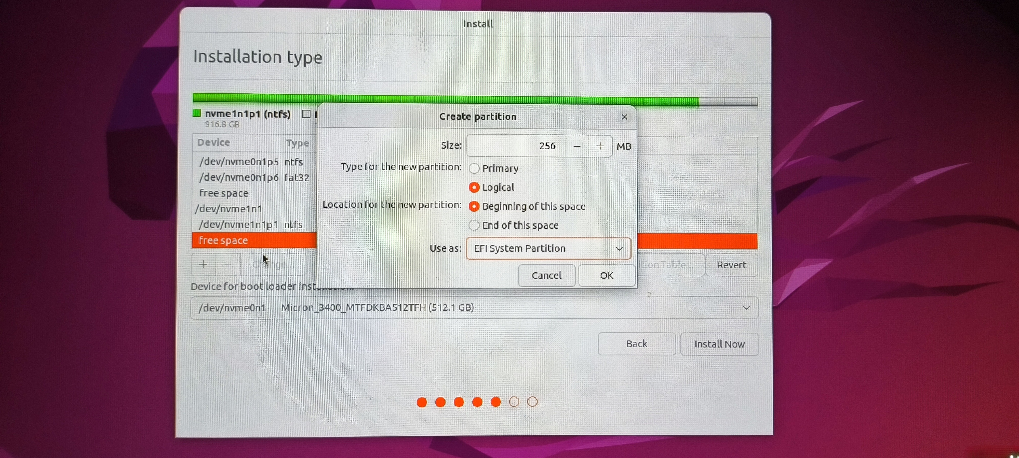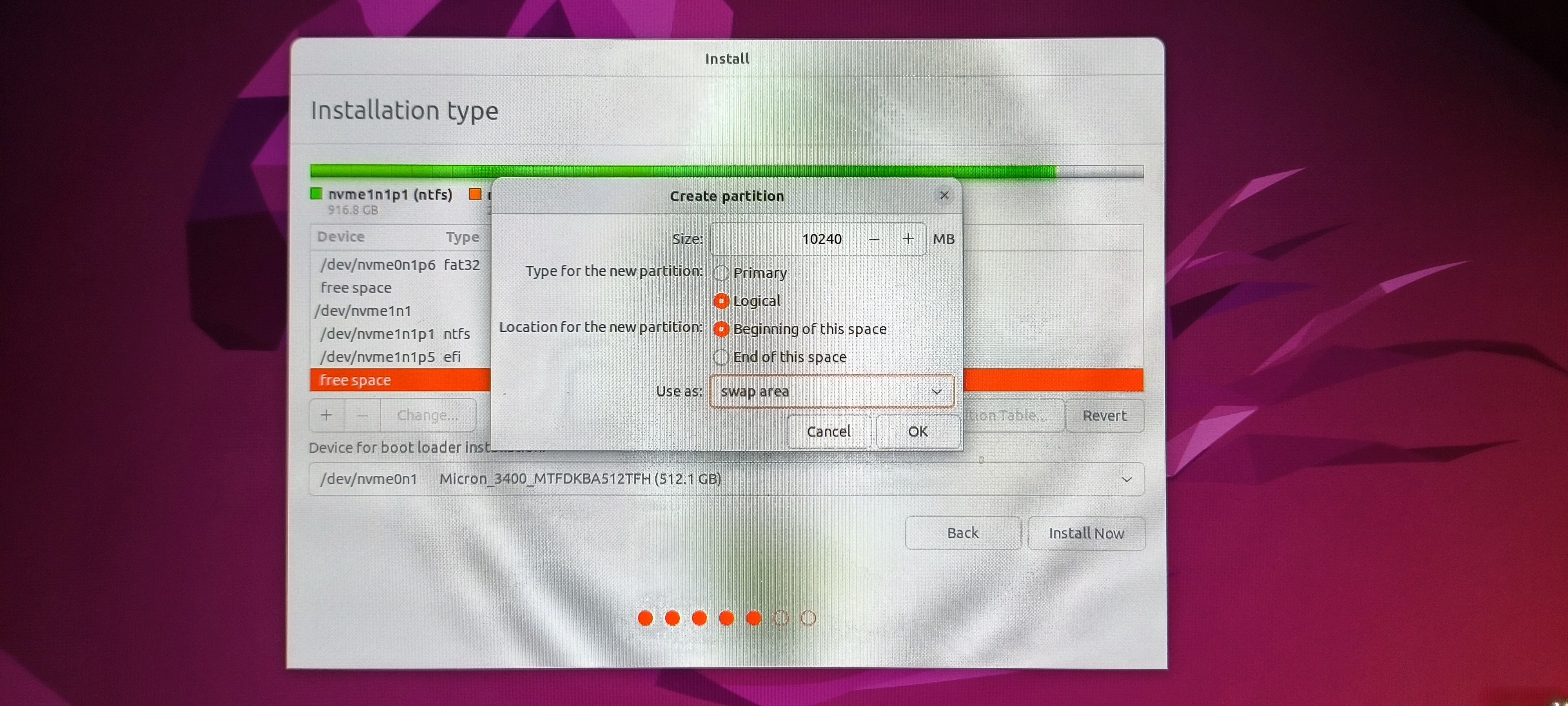 这里稍微解释一下主分区和逻辑分区的区别。对于一块硬盘来说,主分区只能有4个。 因此,我们最好把交换空间设置为逻辑分区。