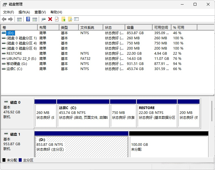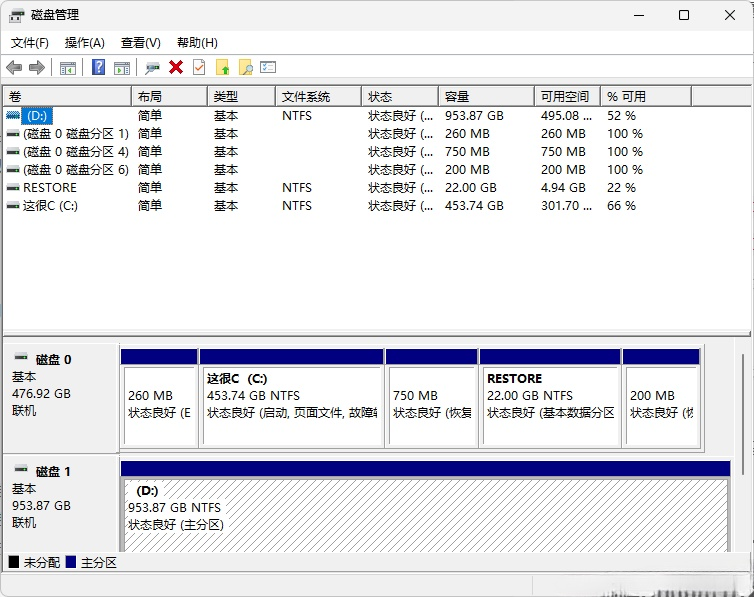 卷 5 D NTFS 磁盘分区 953 GB 正常