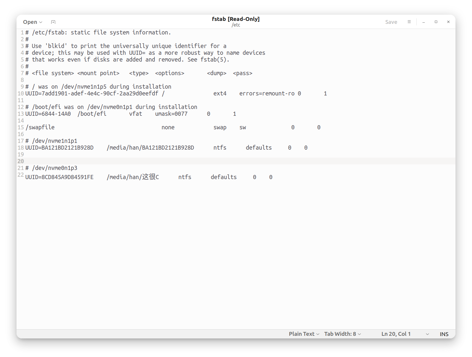 sudo gedit /etc/fstab