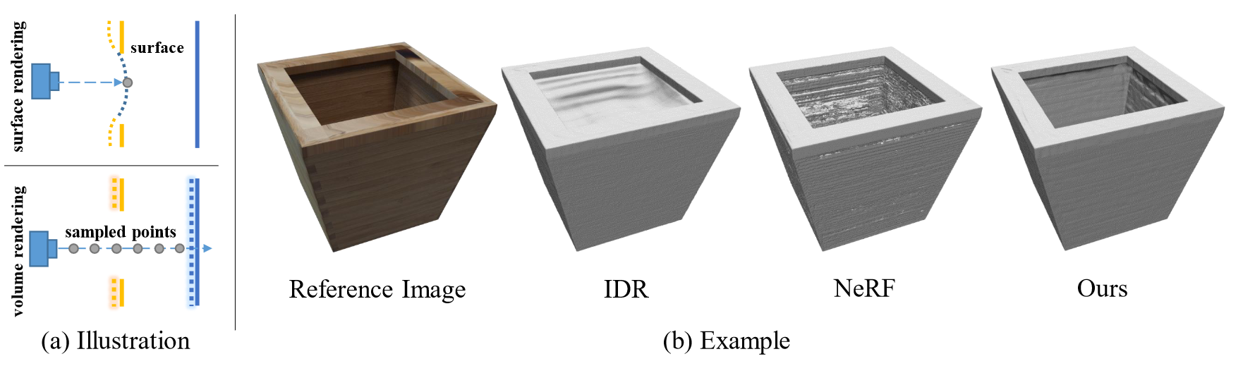 - Surface Rendering方法只是考虑每条射线与物体表面相交的单个交点(如a所示),从而无法重建具有复杂结构的物体表面(如b所示)。具体原因是,梯度只存在于射线与表面相交的这个单点,这对于有效的反向传播来说太局部了,并且当物体表面的深度发生突变时,优化会陷入不良的局部最小值。此外,Surface Rendering方法还需要前景掩膜作为收敛到有效表面的监督。