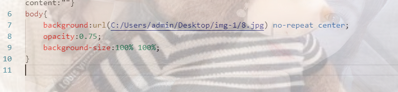 body{ background:url(C:/Users/admin/Desktop/img-1/8.jpg) no-repeat center; opacity:0.75; background-size:100% 100%; }