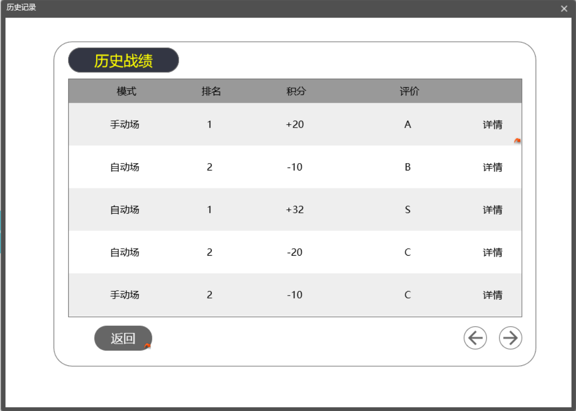 历史战绩界面,可以通过点击详情查看历史对局细节。