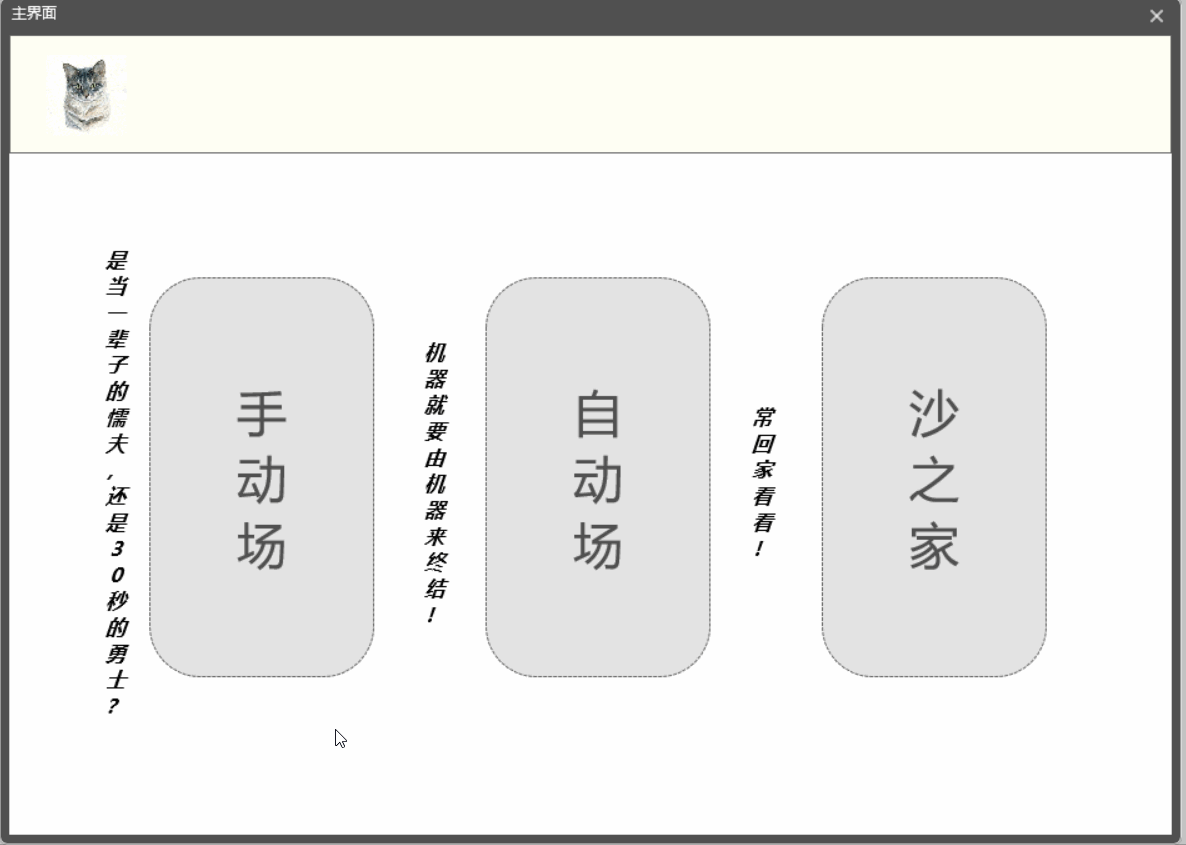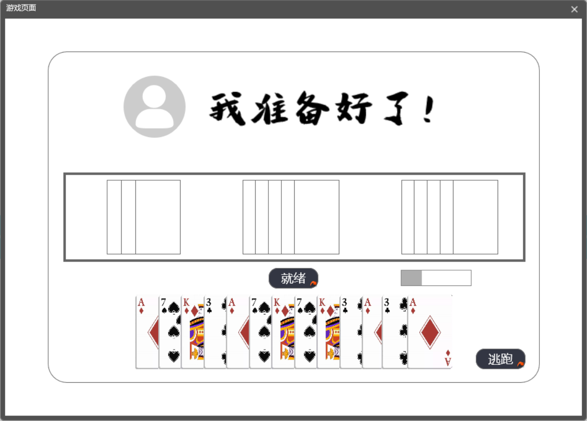 游戏界面分为手动场和自动场,手动场会进入一个出牌界面,允许你出牌以及逃跑!你的对手如果已经出牌会显示“我准备好了!”,当然可能你的对手宕机了,就会慢一点,还有一个30s的倒计时。之后会进入一个结算界面。