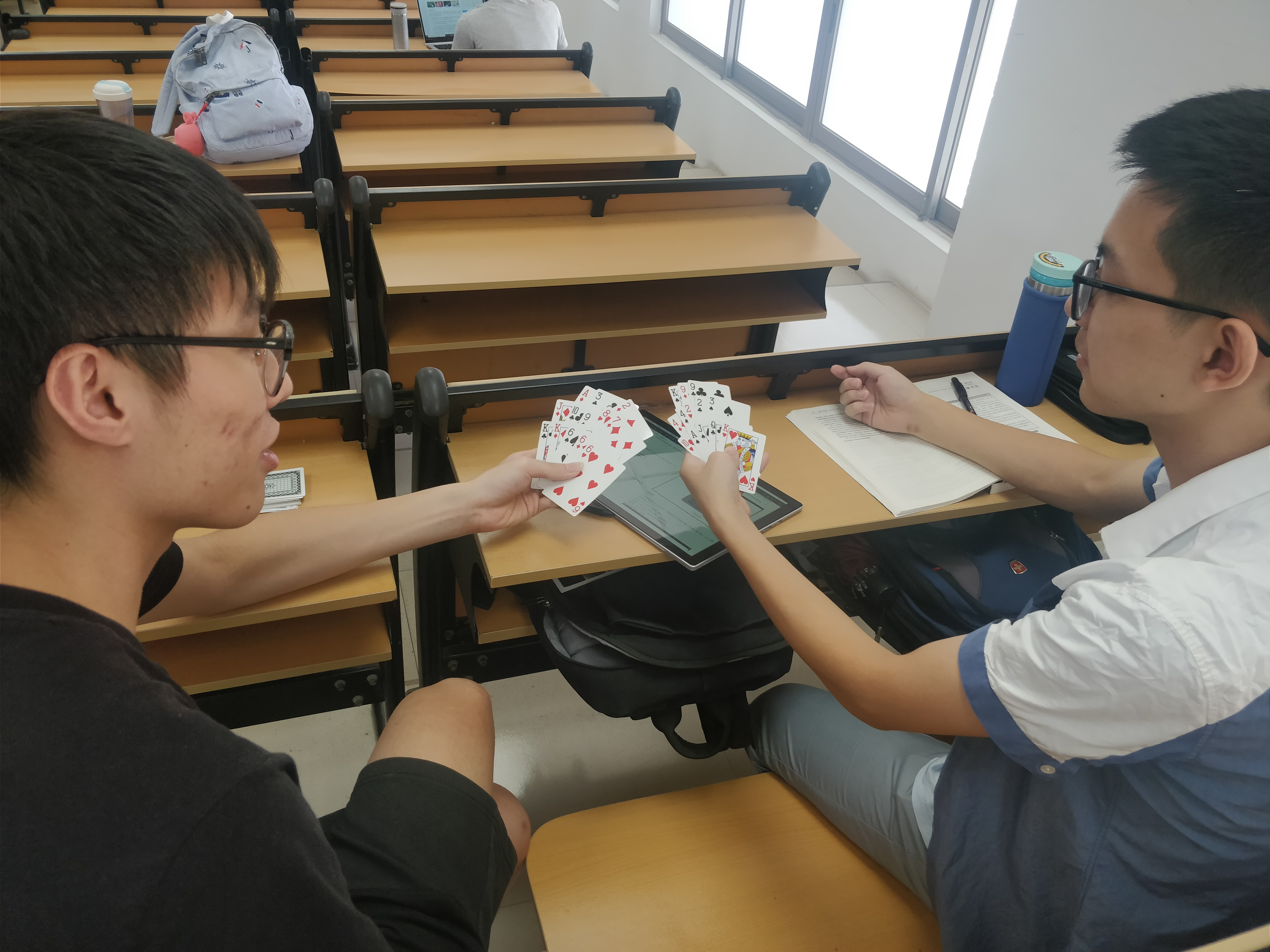 不过既然我的队友在这方面有所建树(本子画师!)那当然得交给擅长的人来做了,这叫合理分配,有理有据。但我也没闲着,我就先去写了写后续要用的算法框架,现在的情况已能跑,但还没加入人工智能的因素,只是单纯的无脑上大牌,一般这种情况第一墩都会是渣渣,纯后台,纯代码,无接口,无UI,良心产品。