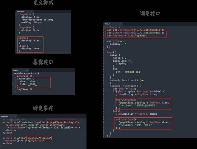 老司机一看就知道是 MVVC 模式,这样分离也就是为了 UI 有独立的控制器,不至于和业务逻辑耦合严重,在页面开发的阶段就可以完成 UI 上的变化。从这个角度上看,小程序反而能给 UI 工程师更多控制 UI 逻辑的能力,确定好代码规范和接口。