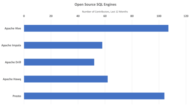 对于开源项目来说,最佳的健康度量是它的活跃开发者社区的大小。如下面的图3所示,Hive 和Presto 有最大的贡献者基础。(Spark SQL 的数据暂缺)