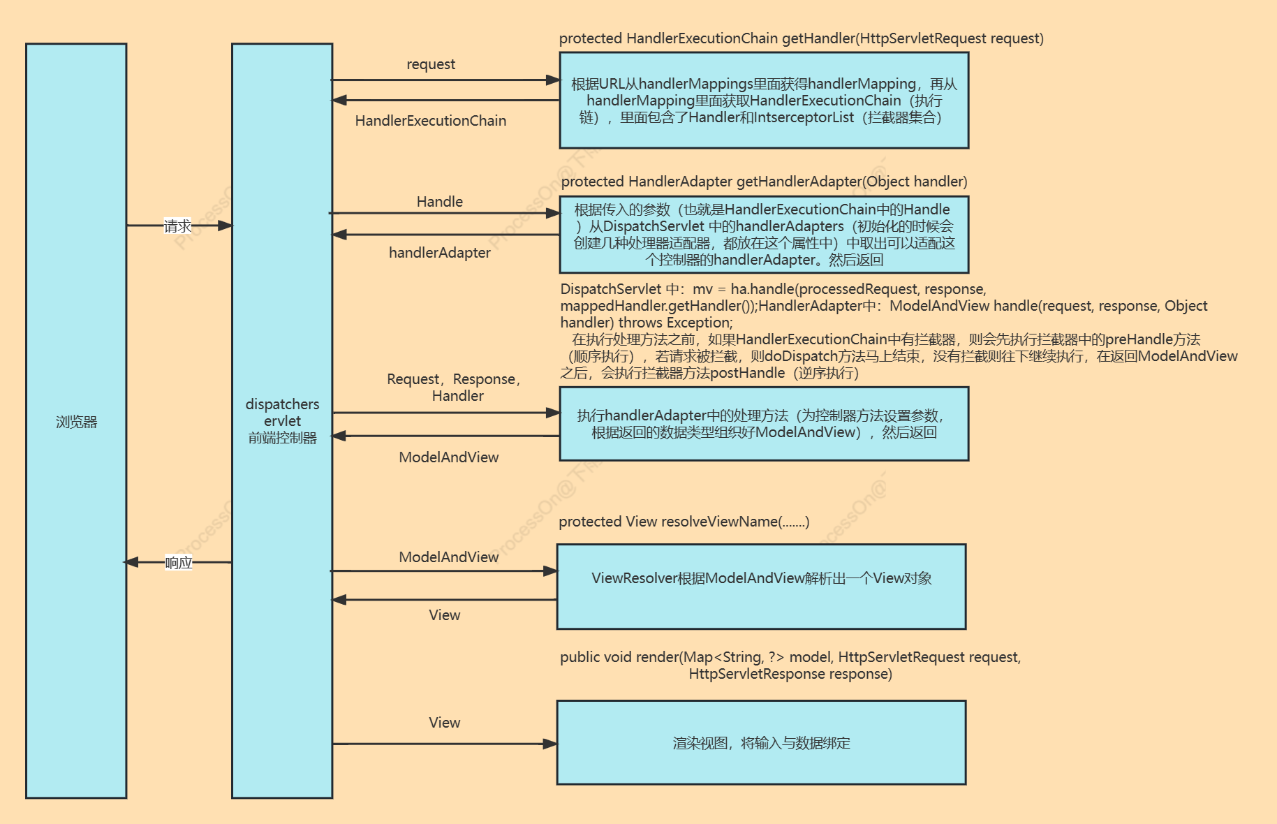 根据该URI,调用HandlerMapping获得该Handler配置的所有相关的对象(包括Handler对象以及Handler对象对应的拦截器),最后以HandlerExecutionChain执行链对象的形式返回。