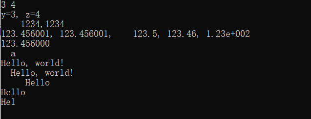 #include <stdio.h> int main() { int x=1234; float f=123.456; double m=123.456; char ch='a'; char a[]="Hello, world!"; int y=3, z=4; printf("%d %d\n", y, z); printf("y=%d, z=%d\n", y,z); printf("%8d,%2d\n", x,x); printf("%f, %8f, %8.1f, %0.2f, %.2e\n",f,f,f,f,f); printf("%lf\n",m); printf("%3c\n", ch); printf("%s\n%15s\n%10.5s\n%2.5s\n%.3s\n",a,a,a,a,a); return 0; }