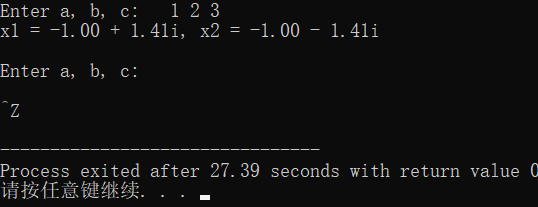 #include <math.h> #include <stdio.h> int main(){ float a, b, c, x1, x2; float delta, real, imag; printf("Enter a, b, c: " ); while (scanf("%f%f%f",&a,&b,&c ) != EOF) { if (a == 0) printf("not quadratic equation.\n\n"); else{ delta = b*b -4*a*c; if (delta >= 0) { x1 = (-b + sqrt(delta)) / (2*a); x2 = (-b - sqrt(delta)) / (2*a); printf("x1 = %.2f,x2 = %.2f\n\n",x1, x2); } else{ real = -b/(2*a); imag = sqrt(-delta) / (2*a); printf("x1 = %.2f + %.2fi, x2 = %.2f - %.2fi\n\n", real,imag, real, imag); } } printf("Enter a, b, c: "); } return 0; }
