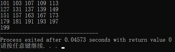 #include <stdio.h> #include <math.h> int main(){ int x,y=100,z=0,i; while (y<=199){ y+=1; x=(int)sqrt( (double) y); for (i = 2; i <= y; i++) if(y%i==0) break; if (i>x){ z+=1; if (z%5==0) printf("%d\n",y); else printf("%d ",y); } } }