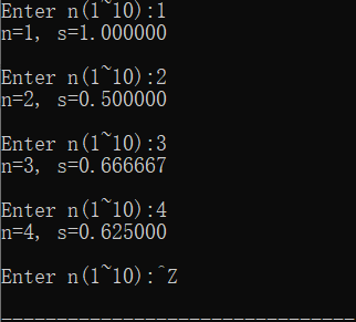 #include <stdio.h> int main(){ int n,i,c,f; double s,b; printf("Enter n(1~10):"); while (scanf("%d",&n)!=EOF) { c = 1,f=-1,s=0; for (i = 1; i <= n; i++) { f=f*(-1); c=c*i; b=1.0/c*f; s=s+b; } printf("n=%d, s=%f\n",n,s); printf("\nEnter n(1~10):"); } return 0; }