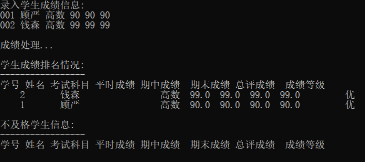// P280例8.15 // 对教材上的程序作了微调整,把输出学生信息单独编写成一个函数模块 // 打印不及格学生信息和所有学生信息程分别调用 #include<stdio.h> #include<stdlib.h> #include<string.h> #define N 2 // 运行程序输入测试时,可以把N改小一些输入测试 typedef struct student { int id; /*学生学号 */ char name[20]; /*学生姓名 */ char subject[20]; /*考试科目 */ float perf; /*平时成绩 */ float mid; /* 期中成绩 */ float final; /* 期末成绩 */ float total; /* 总评成绩 */ char level[10]; /* 成绩等级 */ } STU; void input(STU[],int ); /*输入学生信息 */ void calc(STU[],int); /*计算总评和等级 */ int fail(STU[],STU [],int); /*不及格学生统计 */ void sort(STU[],int); /*排序 */ void print(STU[], int); /*输出学生信息*/ int main() { STU st[N],fst[N]; // 数组st记录学生信息,fst记录不及格学生信息 int k; // 用于记录不及格学生个数 printf("录入学生成绩信息:\n"); input(st,N); printf("\n成绩处理...\n"); calc(st,N); k = fail(st,fst,N); sort(st, N); printf("\n学生成绩排名情况:\n"); print(st, N); printf("\n不及格学生信息:\n"); print(fst, k); return 0; } // 输入学生信息 void input(STU s[],int n) { int i; for(i=0;i<n;i++) scanf("%d %s %s %f %f %f",&s[i].id,s[i].name,s[i].subject,&s[i].perf,&s[i].mid,&s[i].final); } // 计算总评和等级 void calc(STU s[],int n) { int i; for(i=0;i<n;i++) { s[i].total=s[i].perf*0.2+s[i].mid*0.2+s[i].final*0.6; if(s[i].total>=90) strcpy(s[i].level,"优"); // 注意:等级是字符型数组,要使用strcpy完成赋值 else if(s[i].total>=80 && s[i].total<90) strcpy(s[i].level,"良"); else if(s[i].total>=70 && s[i].total<80) strcpy(s[i].level,"中"); else if(s[i].total>=60 && s[i].total<70) strcpy(s[i].level,"及格"); else strcpy(s[i].level,"不及格"); } } // 不及格学生统计 // 数组s存放的是所有学生信息,数组t存放不及格学生信息,n是数组s中元素个数 // 函数返回值:返回的是不及格人数 int fail(STU s[],STU t[],int n) { int i,k=0; for(i=0;i<n;i++) if(s[i].total<60) t[k++]=s[i]; return k; } // 根据总评成绩对学生记录信息排序 // 使用的是冒泡排序算法 void sort(STU s[],int n) { int i,j; STU temp; for(i=0;i<n-1;i++) for(j=0;j<n-1-i;j++) if(s[j].total<s[j+1].total) { temp = s[j]; s[j] = s[j+1]; s[j+1] = temp; } } // 输出学生信息 void print(STU s[], int n) { int i; printf("-----------------\n"); printf("学号 姓名 考试科目 平时成绩 期中成绩 期末成绩 总评成绩 成绩等级\n"); for(i=0;i<n;i++) printf("%5d %10s%20s %5.1f %5.1f %5.1f %5.1f %10s\n",s[i].id,s[i].name,s[i].subject,s[i].perf,s[i].mid,s[i].final,s[i].total,s[i].level); }
