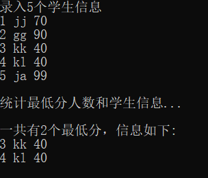 #include <stdio.h> const int N=5; // 定义结构体类型struct student,并定义STU为其别名 typedef struct student { long no; char name[20]; int score; }STU; // 函数声明 void input(STU s[], int n); int findMinlist(STU s[], STU t[], int n); void output(STU s[], int n); int main() { STU stu[N], minlist[N]; int count; printf("录入%d个学生信息\n", N); input(stu, N); printf("\n统计最低分人数和学生信息...\n"); count = findMinlist(stu, minlist, N); printf("\n一共有%d个最低分,信息如下:\n", count); output(minlist, count); return 0; } // 输入n个学生信息,存放在结构体数组s中 void input(STU s[], int n) { int i; for(i=0; i<n; i++) scanf("%ld %s %d", &s[i].no, s[i].name, &s[i].score); } // 输出结构体s中n个元素信息 void output(STU s[], int n) { int i; for(i=0; i<n; i++) printf("%ld %s %d\n", s[i].no, s[i].name, s[i].score); } // 在结构体数组s中,查找最低分学生的记录,将其存入结构体数组t中 // 形参n是结构体数组s中元素个数 // 函数返回最低分的学生人数 int findMinlist(STU s[], STU t[], int n) { int i,c,j; c=s[0].score; j=0; for(i=0;i<n;i++) { if(s[i].score<=c) { c=s[i].score; } } for(i=0;i<n;i++) { if(s[i].score==c) { t[j]=s[i]; j++; } } return j; }