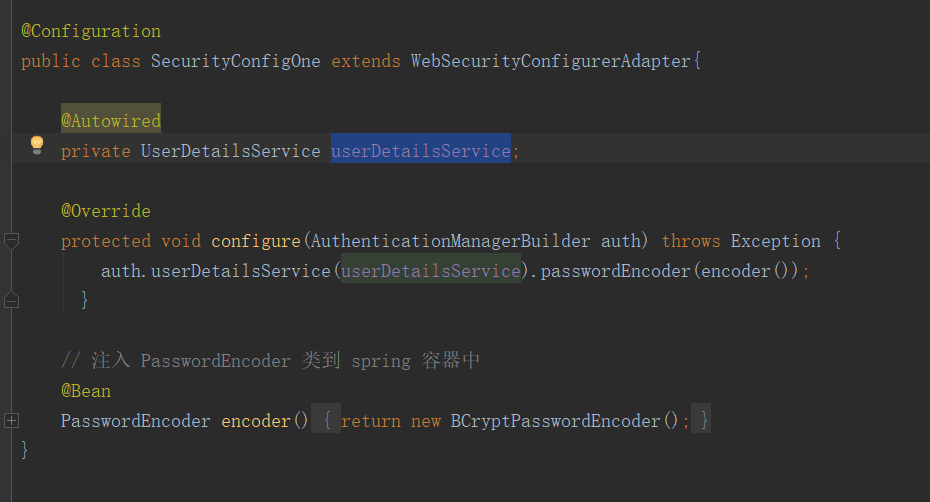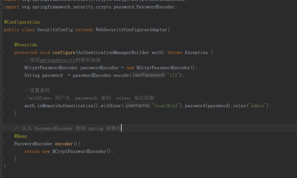 定义一个config的配置类,加上@Configuration 表示为配置类,继承 WebSecurityConfigurerAdapter 实现configure(AuthenticationManagerBuilder auth)这个方法