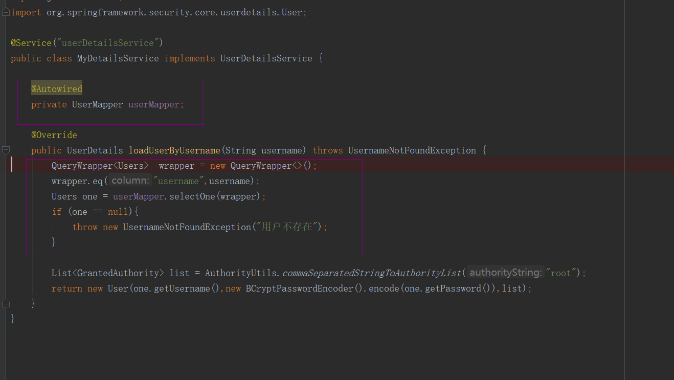下边是从数据库查询的用户校验(本方式使用Mybatisplus进行查询数据),记得在启动类添加扫描@MapperScan(value = "xxx.com.securitydemo01")