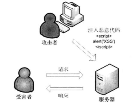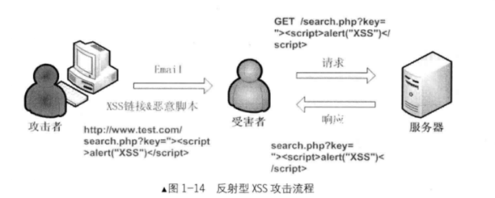 图1-14是其攻击流程,可以看到攻击者将含有恶意脚本的XSS链接通过email的方式发送给目标用户,当用户访问该链接时, 服务器接收用户的请求并处理,然后服务器把带有XSS的数据发给用户浏览器,浏览器解析这个恶意脚本,就会触发XSS漏洞。