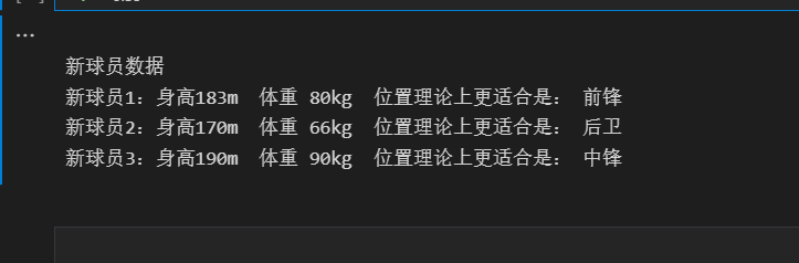 print('新球员%d:身高%3dm 体重%3dkg 位置理论上更适合是: %s'%(i+1,myTests[i][0],myTests[i][1],Newdatabestclass[i]))