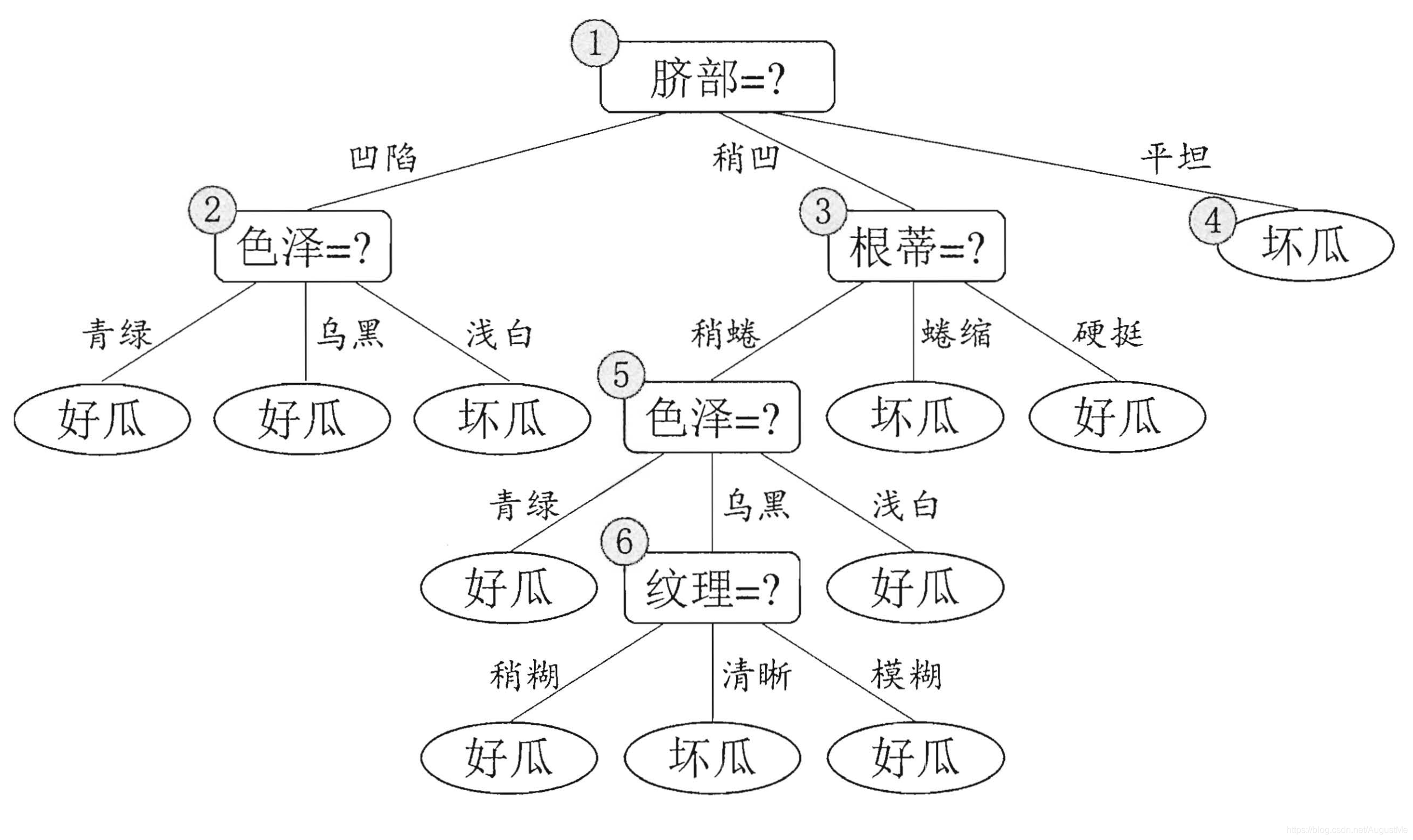 首先先看节点⑥,节点6中包含编号为{7(好瓜),15(坏瓜)}的训练样本,因此我们将节点⑥变成叶节点并标记为“好瓜(坏瓜也ok)”。如下所示: