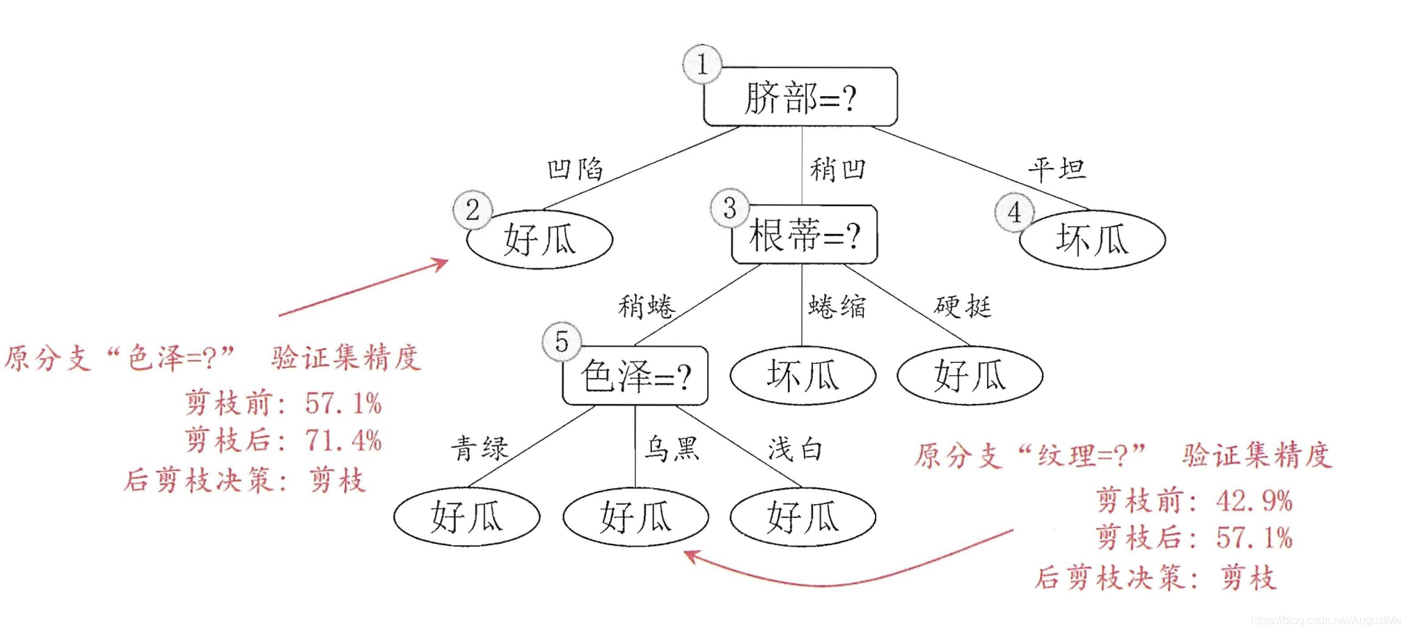 在这种情况下,验证集中序号为{4,8,11,12}验证正确,精度调高到57.1%,因此可以进行剪枝。考虑结点⑤,包含编号为{6,7,15},将其变成叶节点(标记为“好瓜”),使用验证集去验证,其精度仍为57.1%,没有提高,进行考虑。同理可得到下面的这副图片: