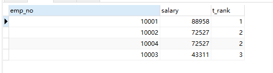 -- SQL编程(不大懂) SELECT emp_no, salary, @rankno := @rankno + ( @pre > ( @pre := salary )) AS t_rank FROM salaries, ( SELECT @rankno := 1, @pre := - 1 ) AS r ORDER BY salary DESC; -- 开窗函数(注意对比row_number()函数) SELECT emp_no, salary, dense_rank() over (ORDER BY salary desc ) t_rank FROM salaries ORDER BY t_rank, emp_no ASC -- 自连接 SELECT s2.emp_no, s2.salary, COUNT( DISTINCT s1.salary ) t_rank FROM salaries s1, salaries s2 WHERE s1.salary >= s2.salary GROUP BY s2.emp_no ORDER BY t_rank , s2.emp_no ASC;