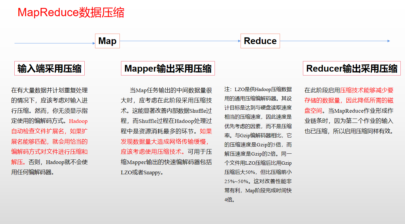对于Reduce阶段来时,需要考虑结果输出的速度,以及是否有后续的MR程序,此阶段要权衡压缩比例与CPU孰高孰低的问题,