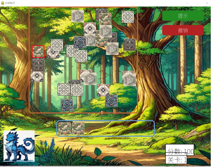 二、游戏中算法的实现:我认为其他的部分不值一提,但是提示功能的算法是真的难倒我了,我最最开始的思路是先尝试简单粗暴的用贪心算法,但是发现因为图案的放置会分三层,当可直接被点击的图案中不足三个可消除的图案时,贪心算法就不能及时的实现提示的功能,所以在思考很久后我最终选择了先用贪心算法,然后在判定可直接被点击的图案中不足三个可消除的图案时使用DFS搜索,虽然算不上完美,效果相对还算可以。但遗憾的是其实在提交前的几个小时我已经有了新的思路,我认为生成图案的部分其实未必要使用随机生成的方式,生成图案的位置不能太简单的最终目的其实就是为了玩家的体验感,所以其实只需要让玩家觉得是随机排列的就足够了,所以我的思路是在生成图案时设定相对比较复杂的规律,比如设定一些图案的放置组合,这样一来实现提示功能的难度就大大降低了,只可惜我未能及时的意识到这一点,无法在本次作业中展示了,但是如果后续有时间或许我会在GitHub上更新提示的功能
