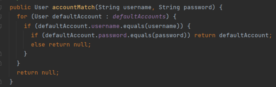 accountMatch函数:用于用户名、密码的正确性判断并返回登陆匹配的User实例对象