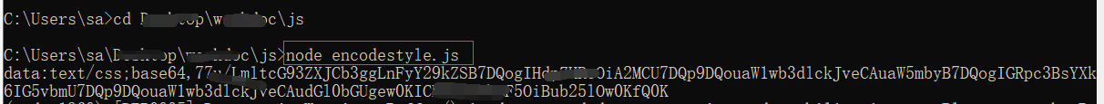 var fs = require("fs"); // function to encode file data to base64 encoded string function base64_encode(file) { // read binary data var bitmap = fs.readFileSync(file); // convert binary data to base64 encoded string return "data:text/css;base64," + new Buffer(bitmap).toString("base64"); } console.log(base64_encode("./wxstyle.css"));// css文件和js文件在同一个文件夹下