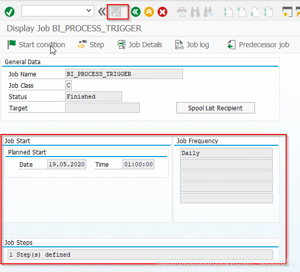 保存后会提示该JOB为Schedule状态,但是由于Start condition是空的。所以该JOB不会执行。