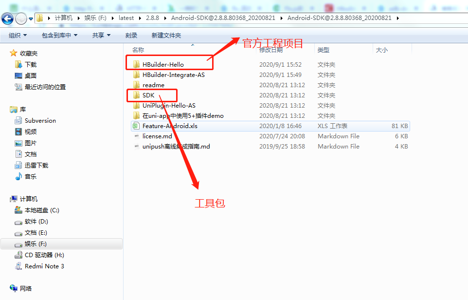 2、生成资源包后,用Android Studio打开HBuilder-Hello工程。HBuilder-Hello是我们在(一、准备)下载的离线包SDK中的官方工程。下图是我在官方下载的离线包SDK: