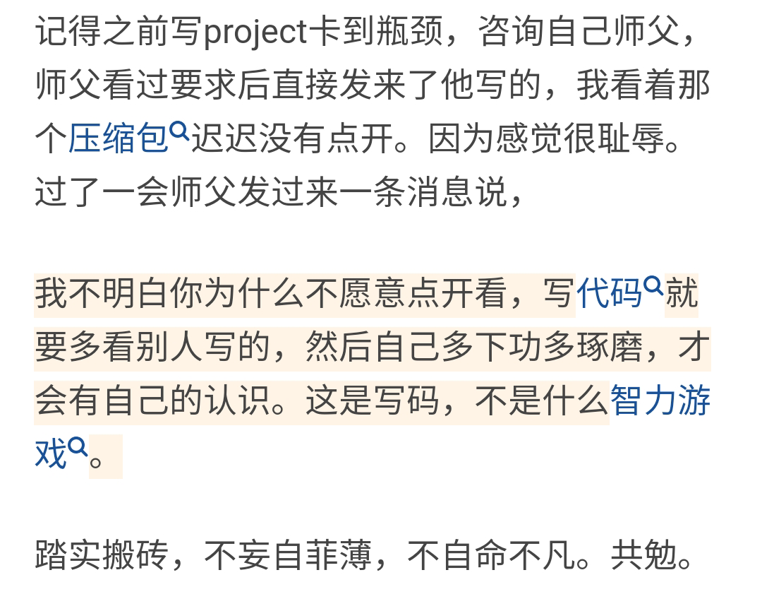 回忆起大二学习C语言有一段时间后,自我感觉必须什么难题都由自己解开,才算得上不愧对自己的智商。遇到中等难度题目还好,难度极高的题目就开始怀疑自己,拿别人作比较。摆烂一段时间后,突然看到一个故事。所以自己也确实追求完美,但是对于初学者来说,追求完美暂且不提,多多犯错,多多“搬砖”(doge),才是首要目标。追求程序上的完美可以暂且放到有一定积累和能力之后。