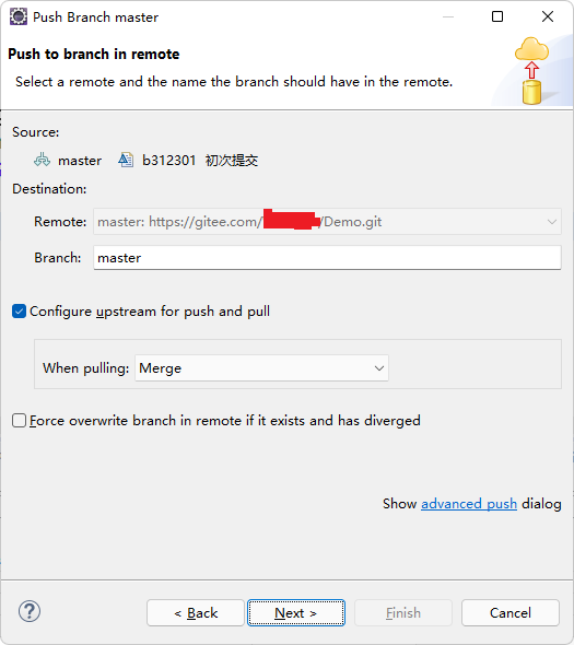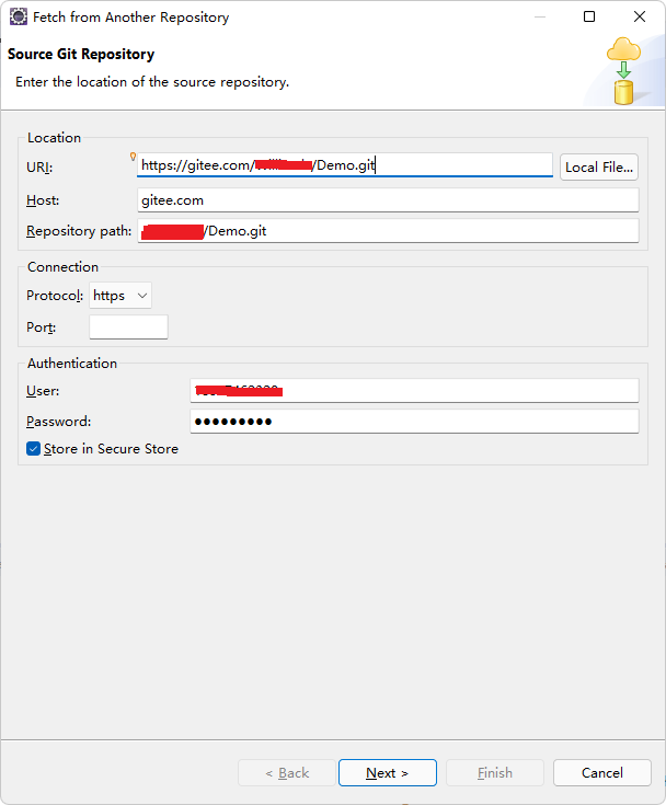 把仓库的链接站粘贴到URI文本框中,其余信息会自动填充,输入gitee的账号密码,点击next