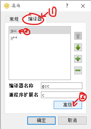 编译器选项卡,选中gcc,点击高级。